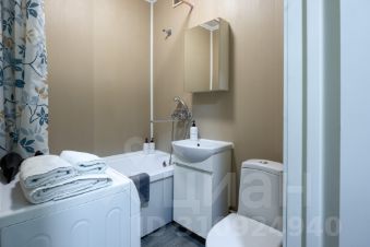 В санузле: ванна, стиральная машина, унитаз, раковина, зеркальный навесной шкаф, фен, шампунь, гель для душа, мыло.