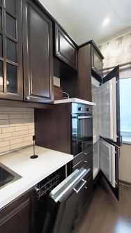 Квартира с евроремонтом с использованием современных экологичных материалов. В спальне — прикроватные тумбы и двуспальная кровать выполнены из натуральной белой кожи, ортопедический матрас. Просторная гардеробная 5 кв.м. укомплектована функциональной фурнитурой IKEA с большим количеством ящиков, примыкает к спальне. Кухонный гарнитур из натурального дерева дополнен бесшумной фурнитурой и техникой премиум-класса: встроенным холодильником, посудомоечной машиной, духовым шкафом, керамической варочной панелью и мелкими бытовыми приборами (блендер, йогуртница). На кухне стоит ортопедический раскладывающийся диван.