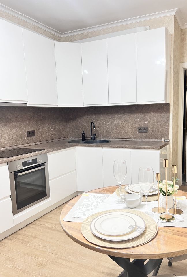 Квартира полностью укомплектована новой техникой для комфортного проживания: холодильник, два смарт-телевизора, стиральная машина, микроволновая печь, отпариватель, чайник, плита, вытяжка и духовка.