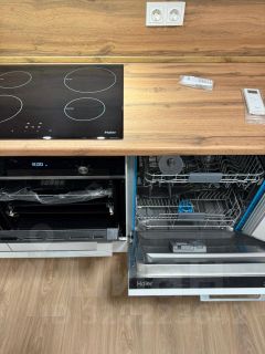 Новая техника: ТВ 50 дюймов, посудомоечная машина, духовой шкаф, варочная панель, холодильник, вытяжка, стиральная машина.