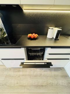 Кухня с техникой (посудомоечная машина, варочная панель, вытяжка, холодильник, микроволновка, кофемашина, чайник, блендер).