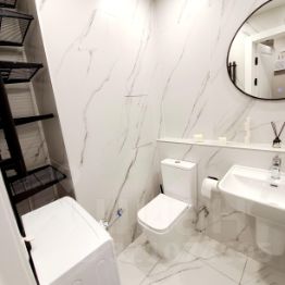 САНУЗЕЛ в светлых тонах оборудован всем необходимым (ванна, унитаз, раковина, зеркало, стиральная машина, полотенцесушитель, полки).