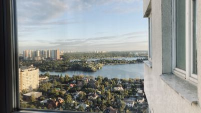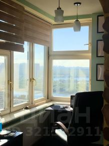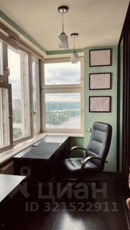 У панорамного окна рабочие место, письменный стол и кресло, с шикарным видом на реку и здание правительства Московской области.