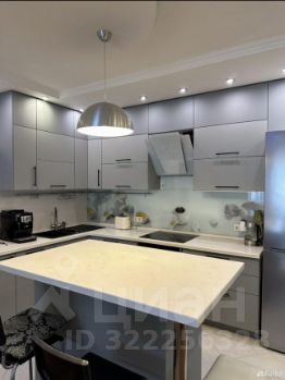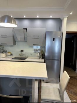 Большая кухня-гостиная с островом, кухня оборудована всей необходимой техникой: посудомоечная машина, холодильник, духовка, микроволновка, индукционная плита