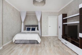 Ванная зона с джакузи и душем, светодиодное зеркало. Для удобства — столик для макияжа и рабочий стол, телевизор SMART TV (на фото их нет). Два спальных места: диван-кровать и кровать с ортопедическим матрасом ORMATEK Navy Lux. Есть вместительные шкафы для хранения.