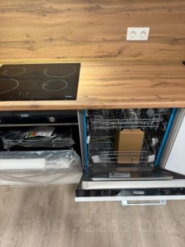 Новая техника: ТВ 50 дюймов, посудомоечная машина, духовой шкаф, варочная панель, холодильник, вытяжка, стиральная машина.