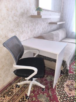 Большая кухня-гостиная с раскладывающимся диваном, обеденной зоной и удобным местом для работы;