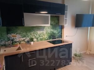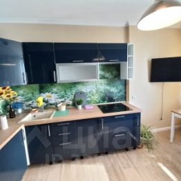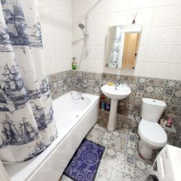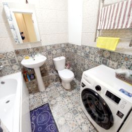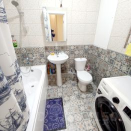 В квартире имеется кухонный гарнитур (из техники - индукционная варочная панель, холодильник, телевизор, электрочайник), раскладной диван, стол, стулья, журнальный столик, шкаф и обувница в прихожей. Полностью оборудованный санузел с ванной и полноразмерной стиральной машиной.