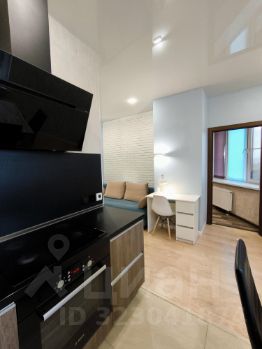 Большая кухня-гостиная зонирована на рабочую зону с письменным столом, зону гостиной с диваном и телевизором и кухню. На кухне встроенные варочная поверхность, духовка, посудомоечная машина 60см, фильтр для питьевой воды, вытяжка, холодильник.