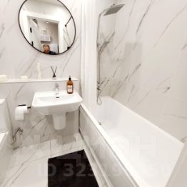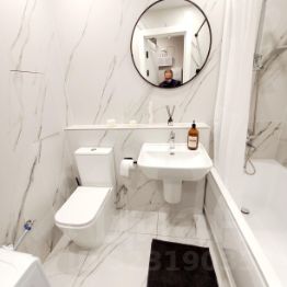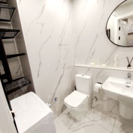 САНУЗЕЛ в светлых тонах оборудован всем необходимым (ванна, унитаз, раковина, зеркало, стиральная машина, полотенцесушитель, полки).