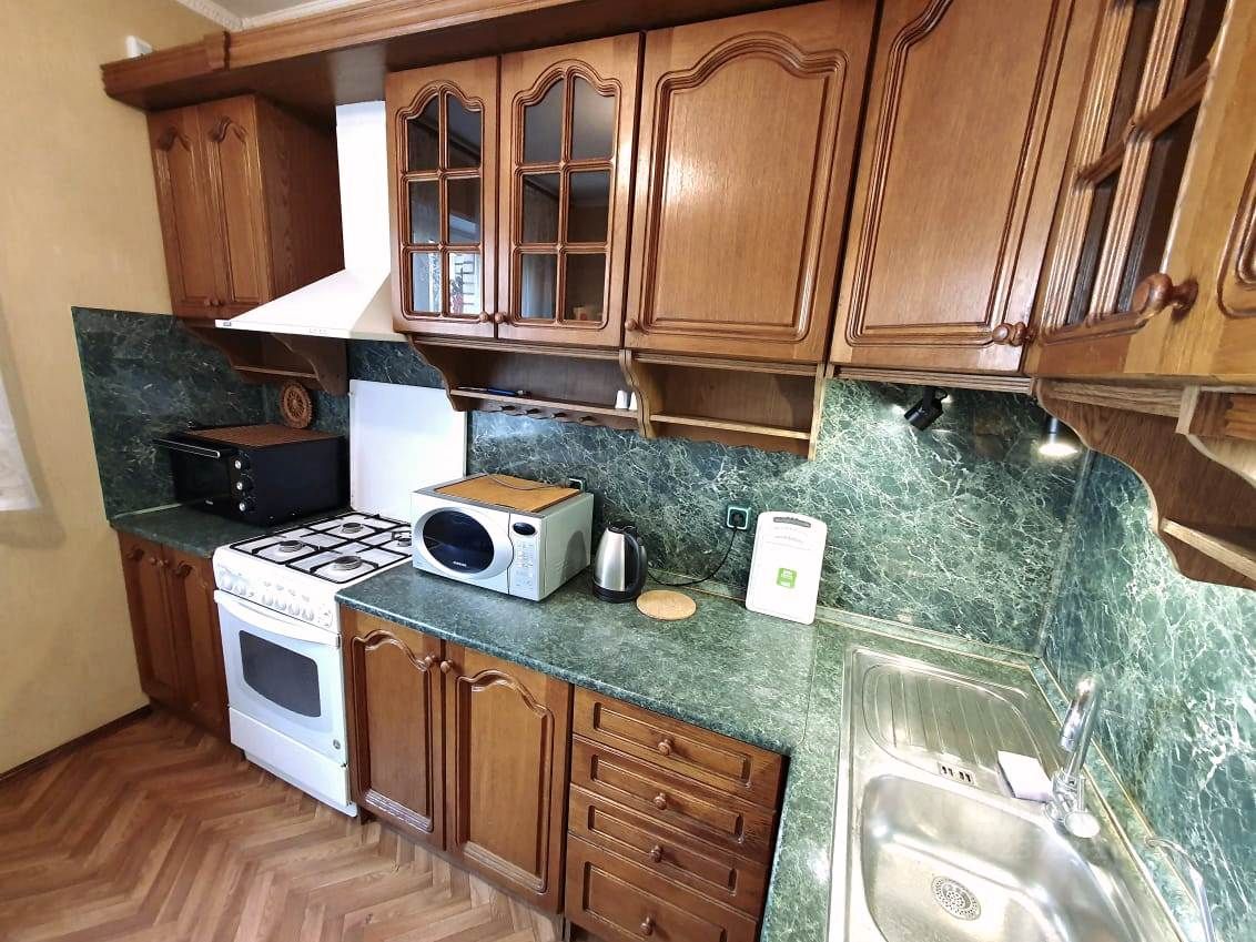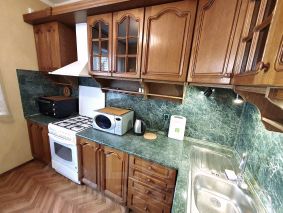 В квартире: сплит-система кондиционирования Panasonic, два ТВ, новая мягкая мебель в двух комнатах, новая стиральная машина, большой семейный холодильник Sharp, газовая плита, микроволновка и электродуховка.
