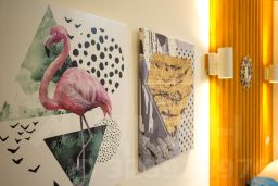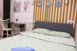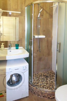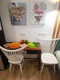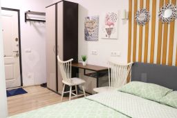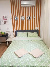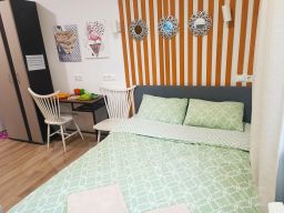 В каждой студии двуспальная кровать, раздвигающаяся на 2 односпальные, обеденный стол со стульями, встроенная кухня с мебелью, техникой, посудой и столовыми приборами. Интернет Wi-Fi, большой SMART-TV на 150 каналов, глаженное постельное белье и полотенца. Санузел с душевой кабиной и стиральной машиной. В общем коридоре есть сушильная машина.