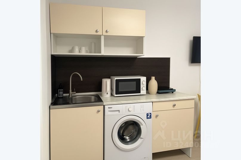 - Кухня с холодильником, плитой, микроволновкой, чайником и посудой