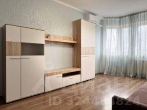 В комнате: двухспальный диван, кондиционер, шкаф-стенка с полками и тумбой под телевизор
