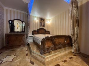 Комната зонирована: большая двуспальная кровать под балдахином, туалетный стол, уютный диван (раскладывается), кресло, шкафы, телевизор, кондиционер.