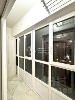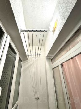 просторная, остекленная лоджия с выведенным светом: подвесная система сушки белья, шкаф-пенал.