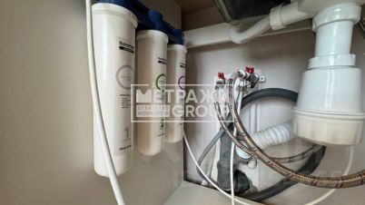 Просторная кухня 13 квадратных метров, в которой установлен новый, современный и качественный кухонный гарнитур - у каждого шкафа и ящика установлены доводчики, установлен фильтр для питьевой воды и интегрированы розетки в рабочую поверхность.