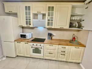 Кухня с необходимыми принадлежностями, духовым шкафом и микроволновкой;