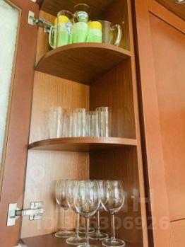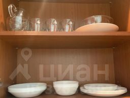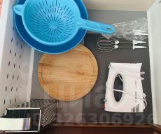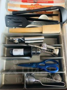 На кухне: обеденный стол, холодильник, варочная панель, духовой шкаф, вытяжка, посудомоечная машина, микроволновая печь, мультиварка, тостер, электрический чайник, посуда и столовые приборы.
