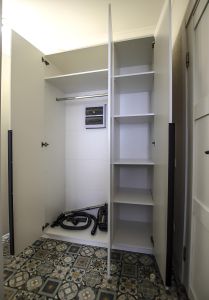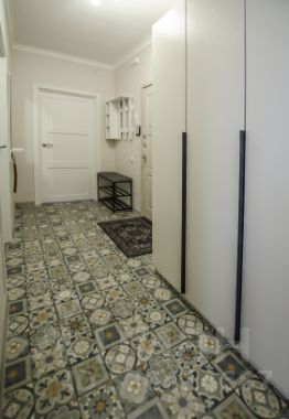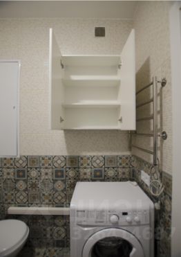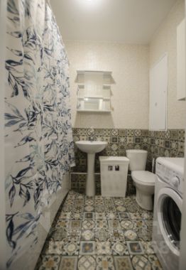 Совмещенный санузел со стиральной машиной и плиткой в потолок. Просторная прихожая с местами хранения.
