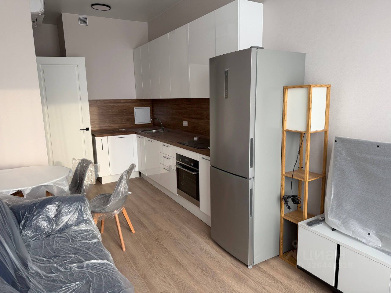 Квартира евродвушка с большим кухонным гарнитуром и обеденной группой, в изолированной комнате обустроена спальня с системой хранения. В прихожей стоит комплект с обувницей, зеркалом и крючками. Обе комнаты закрываются на дверь, это прекрасно разделяет пространство от запахов и шума. Есть застекленный балкон из спальни для хранения вещей.