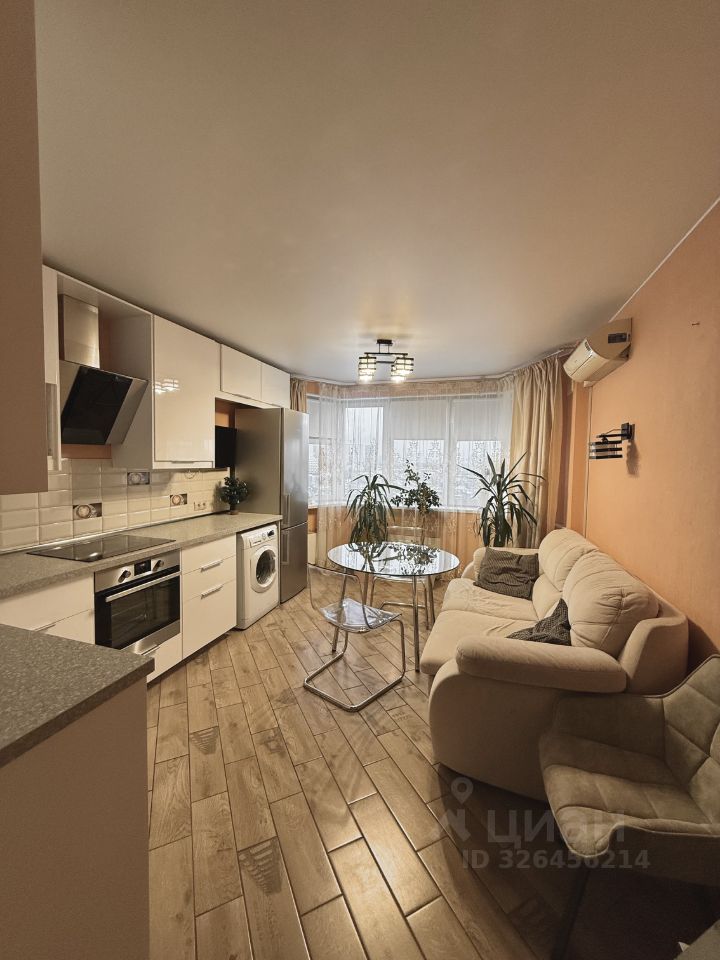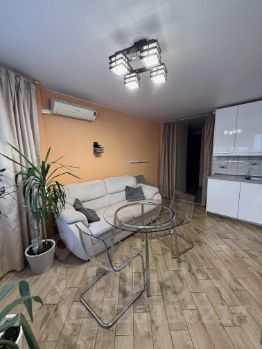Кухня-гостинная: Посудомойка, микроволновка, большой холодильник, варочная панель, духовой шкаф, вытяжка, тихая стиральная машина на 5кг, телевизор, большой раскладной диван, стол со стульями, кондиционер. На полу плитка с теплым полом. встроенный фильтр для питьевой воды и вся необходимая посуда.