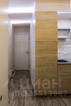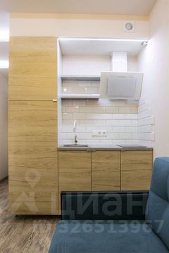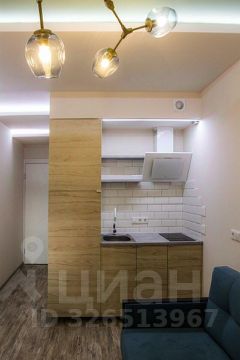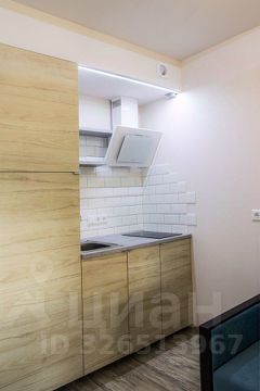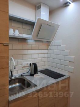 Квартира оборудована полноценной кухонной зоной с необходимой бытовой техникой (холодильник с небольшой морозильной камерой, варочная поверхность с вытяжкой, микроволновая печь, чайник) и посудой.