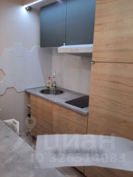Квартира оборудована полноценной кухонной зоной с необходимой бытовой техникой (холодильник с небольшой морозильной камерой, варочная поверхность с вытяжкой, микроволновая печь, чайник) и посудой.