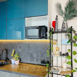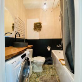 Апартамент полностью готов для проживания: кухонная посуда, утварь, блендер, столовые приборы, стиральная машина с сушкой, блэк-аут шторы, увлажнитель воздуха, кондиционер, пылесос, матрас ИКЕЯ, хлопковое постельное белье (перкаль, поплин) и тяжелое одеяло, под которым прохладно летом и тепло зимой. Предусмотрено скрытое место для проектора, стена подготовлена для просмотра, при желании можно установить большой экран для проектора. В перспективе установка умного замка на входной двери для удобного доступа в уютный уголок