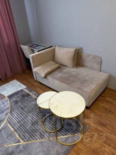В квартире есть двуспальная кровать, одноместный диванчик, рабочее место, туалетный столик, тумба под Тв, журнальный столик, кондиционер, гардеробная комната, кухонный гарнитур, варочная панель, духовой шкаф, холодильник, электровытяжка, СВЧ печь, электрочайник, стол кухонный, стулья 2 шт., посуда, стиральная машинка, сейф, полка для обуви, прихожая, сушилка.