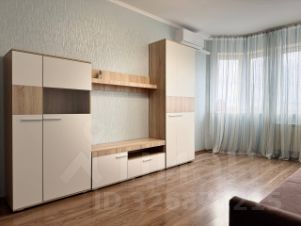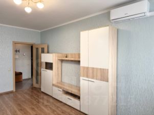 В комнате: двухспальный диван, кондиционер, шкаф-стенка с полками и тумбой под телевизор