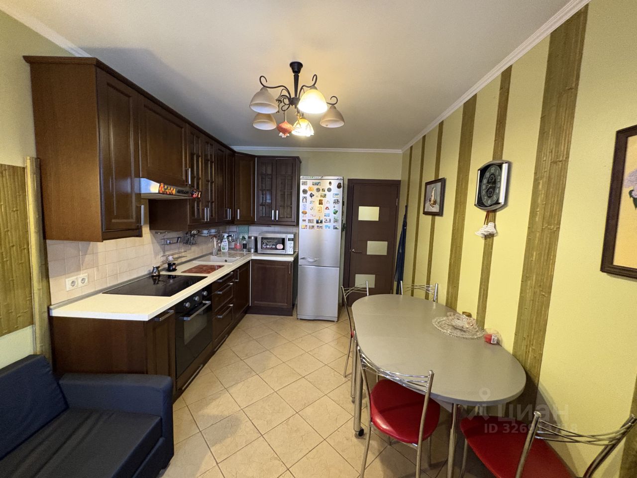 Кухня - кухонный гарнитур, холодильник, варочная панель, духовой шкаф, вытяжка, обеденный стол, 4 стула, вытяжка, микроволновая печь, электрочайник, комод, диван;
