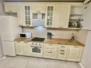 Кухня с необходимыми принадлежностями, духовым шкафом и микроволновкой;