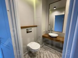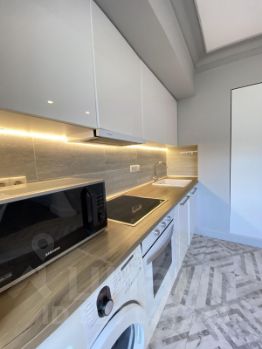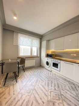 На кухне - встроенная кухня с варочной панелью, вытяжкой, духовым шкафом, есть посудомоечная и стиральная машины. В наличии двухкамерный холодильник, СВЧ-печь, обеденный стол со стульями, встроенный шкаф.