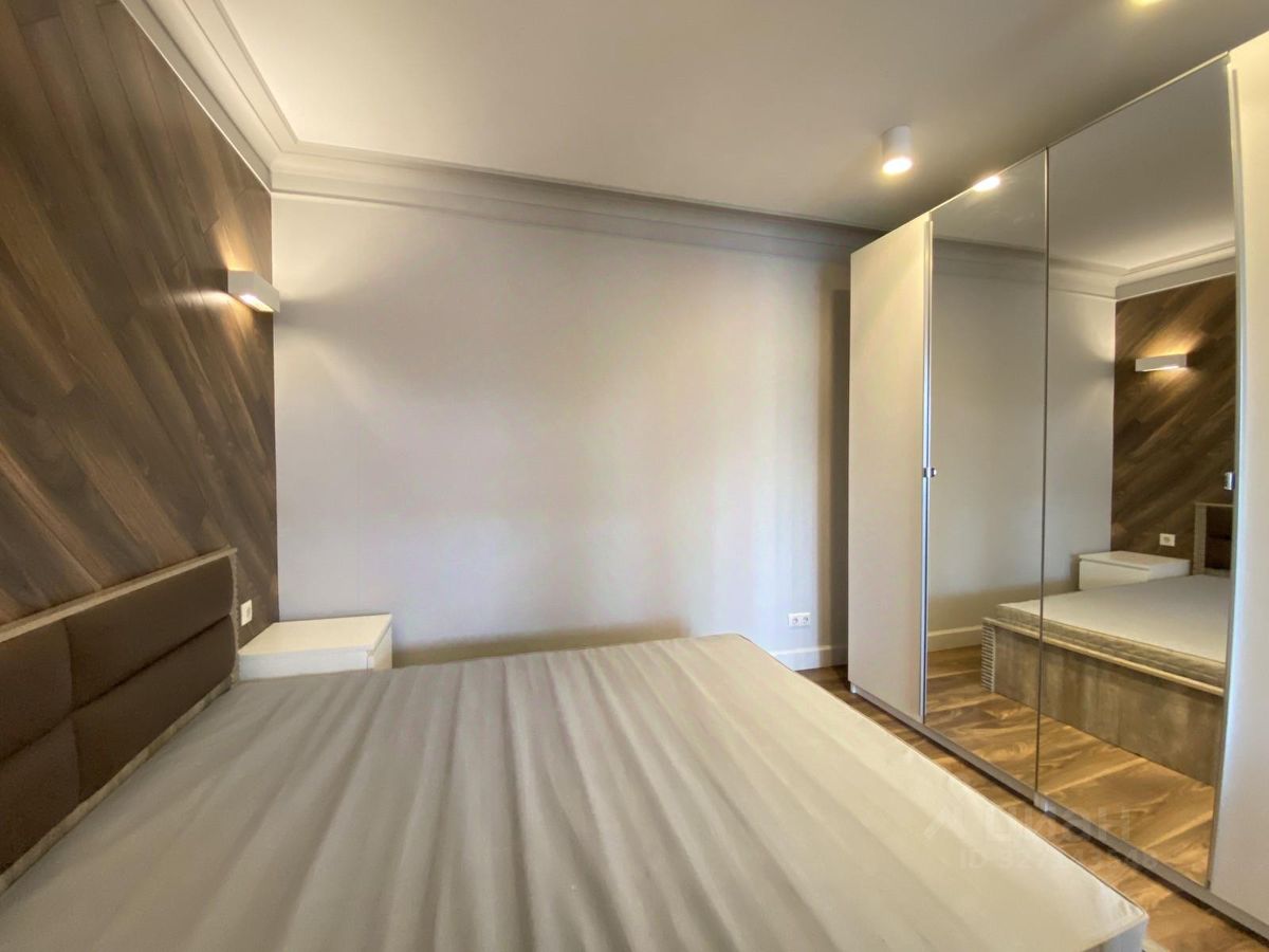 В квартире есть выделенная спальня зона с двуспальной кроватью и вместительным бельевым шкафом с зеркальными дверьми, гостиная зона и просторная кухня.