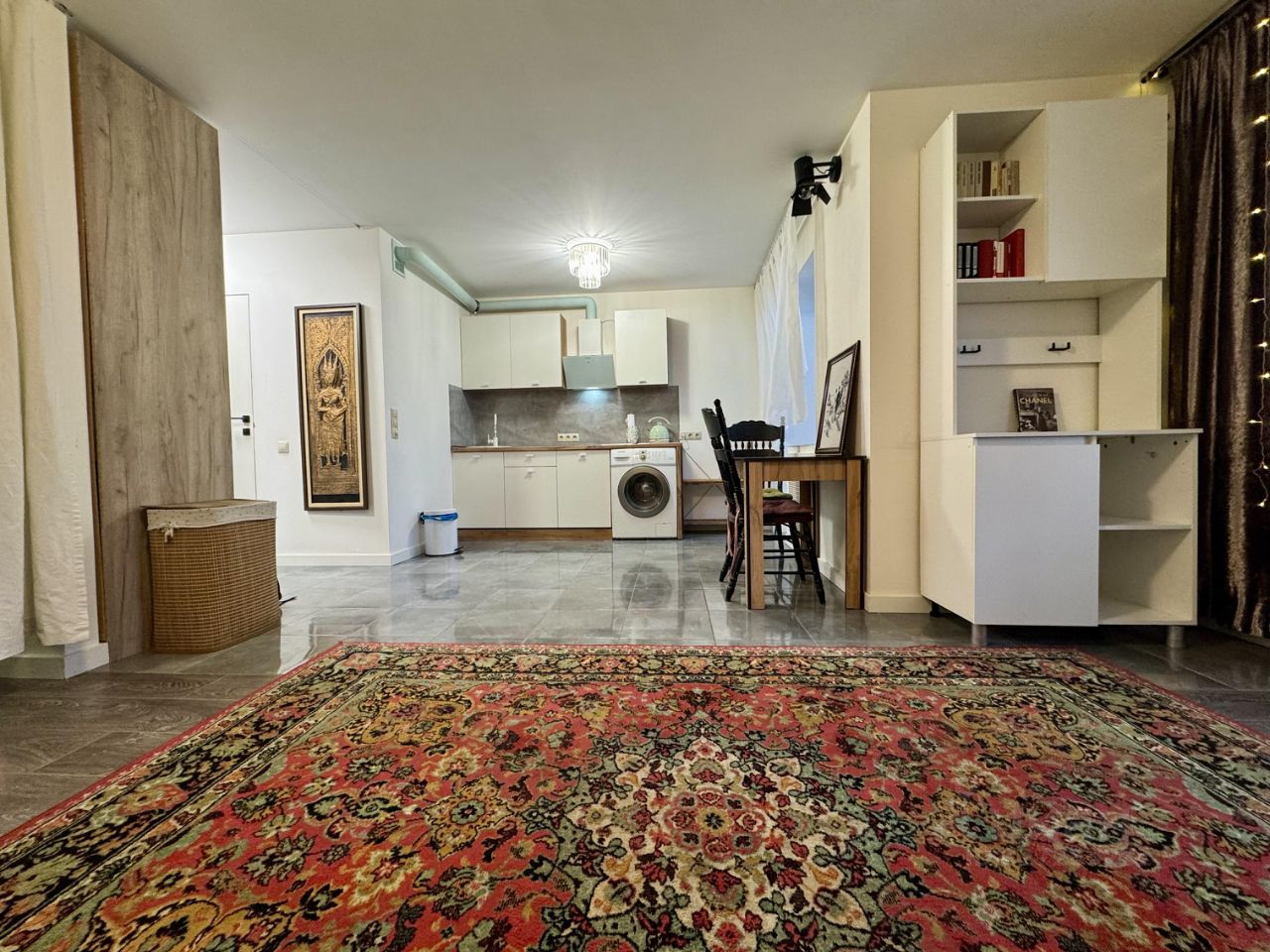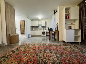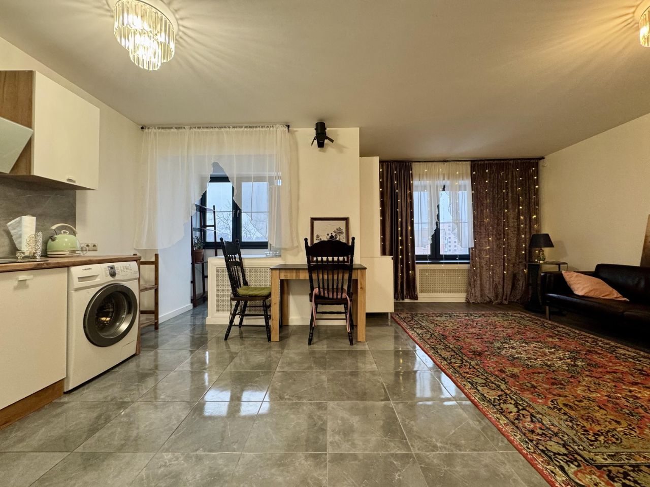 Кухня-гостиная (10+20 м). В кухне белый гарнитур, электрическая варочная панель, вытяжка, стиральная машина. Обособленная спальня (см. фото). Пол - плитка и ламинат.