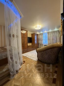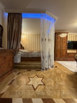 Комната зонирована: большая двуспальная кровать под балдахином, туалетный стол, уютный диван (раскладывается), кресло, шкафы, телевизор, кондиционер.