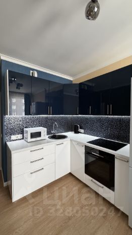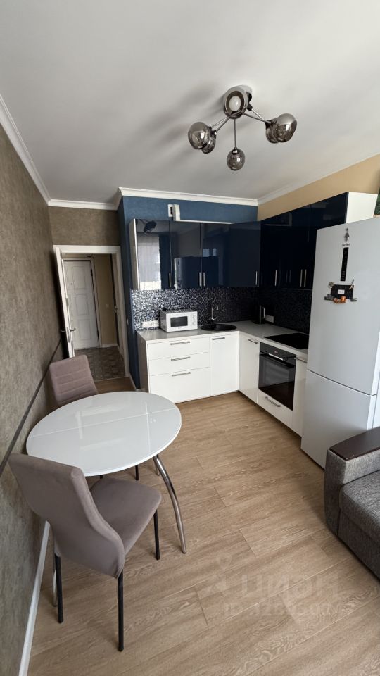 Кухня полностью оборудована для жизни, гарнитур со встроенной техникой (духовка, варочная панель, вытяжка, холодильник, СВЧ). Есть обеденная зона. Раскладной диван, комод.
