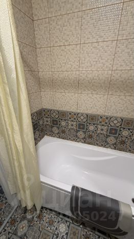Санузел совмещенный, выполнен в плитке, есть большая ванна и стиральная машина.
