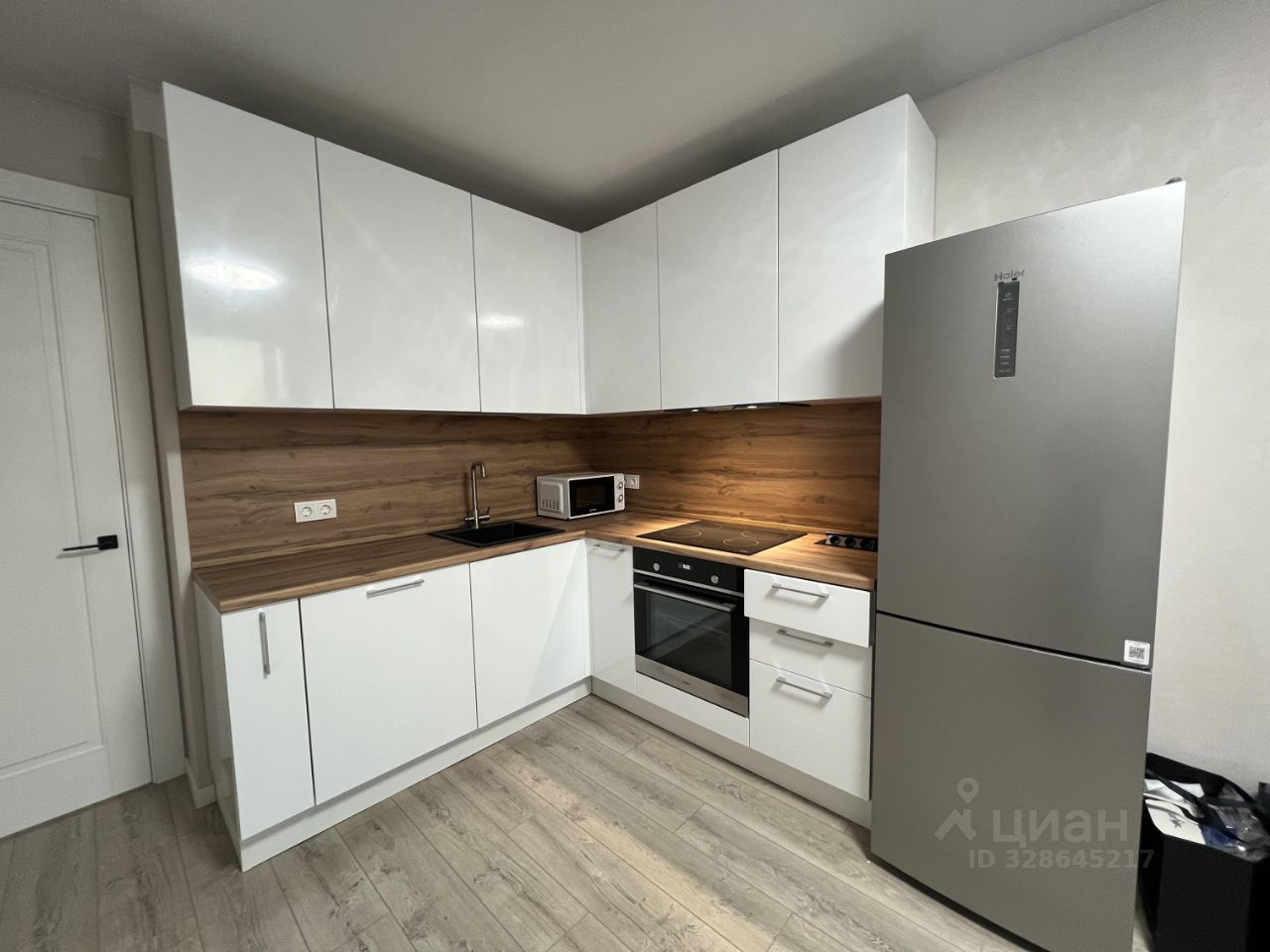 На кухне установлен кухонный гарнитур со встроенной техникой: духовой шкаф, варочная панель, посудомоечная машина, холодильник.