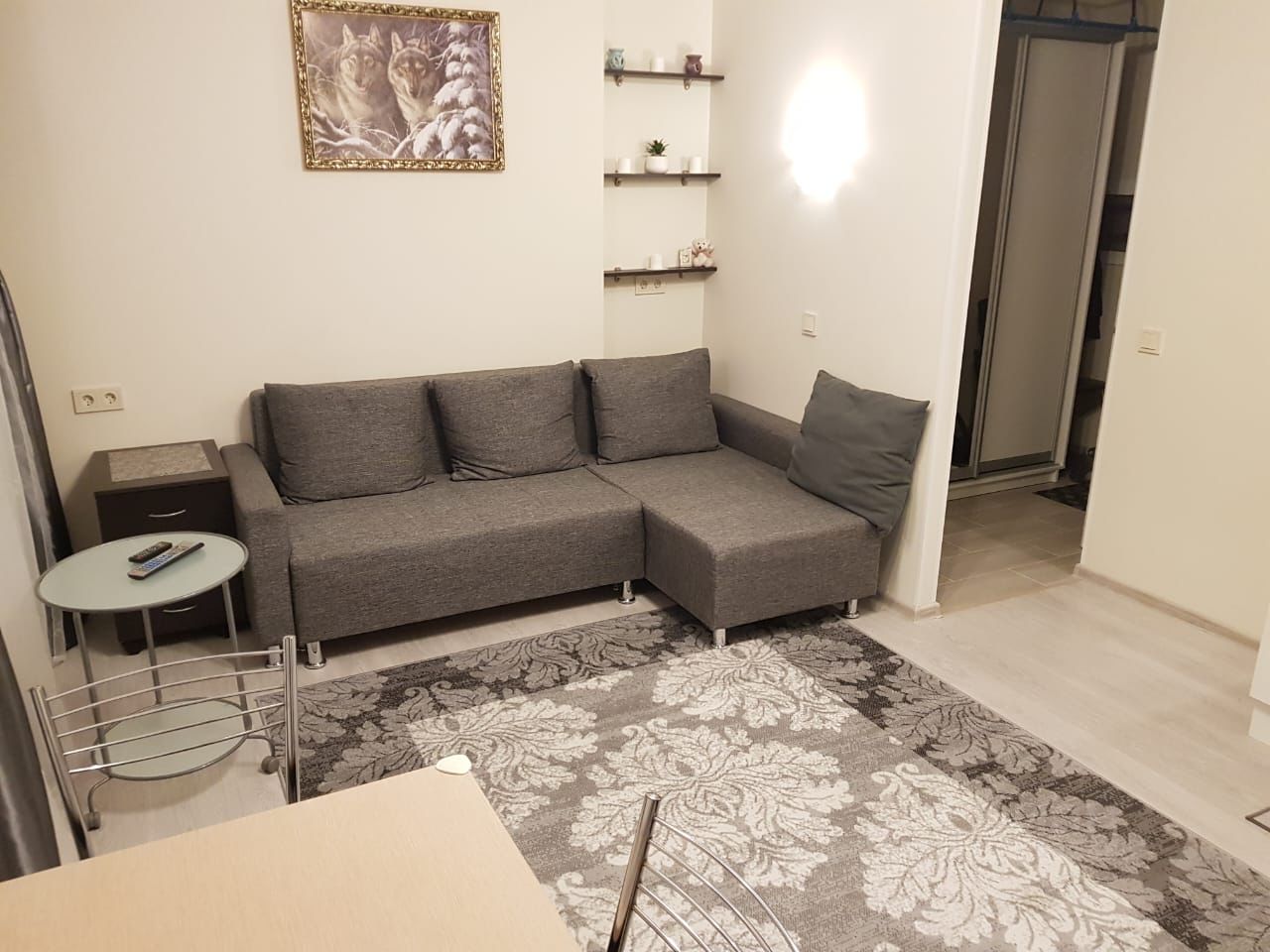 В Квартире имеется Холодильник, мини печка, плита, вытяжка,чайник, посуда, телевизор, стиральная машина, утюг, микроволновая печь, угловой диван раскладывается и др. всё необходимое для проживания. Хорошие и адекватные хозяева.