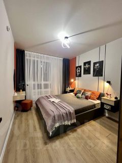 Спальня: просторная комната с широкой кроватью на ортопедическом матрасе, вместительным шкафом и бьюти-зоной.