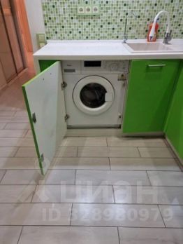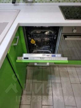 На кухне: гарнитур, стиральная машина, посудомоечная машина, микроволновка, чайник, посуда, тёплый пол
