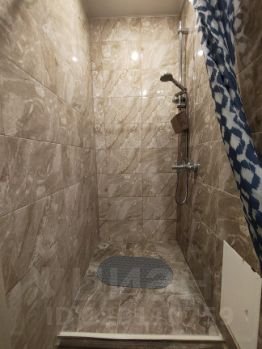 В студии совмещенный санузел с душевой кабиной, а также раковиной с зеркальной подсветкой.