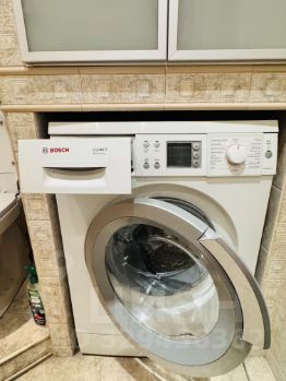 САНУЗЕЛ: в плитке, дорогая качественная сантехника и туалет. Стиральная машинка — BOSCH. Огромная ниша-шкаф над машинкой для хранения бытовой химии. Вместительная монолитная тумба под раковиной, в также кладовка под зашитой ванной. Вытяжка в с/у и гигиенический душ (для кого важно). АБСОЛЮТНО НОВЫЙ БОЙЛЕР, который сделает проживание в квартире комфортным в летний период отключения ГВС.