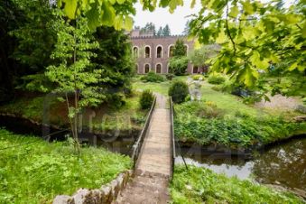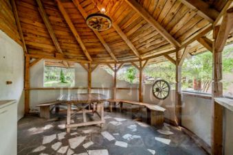 УЧАСТОК: просторный участок 100 соток, по которому протекает река Банька. Множество хвойных и лиственных деревьев. Открытая веранда в форме юрты. Мостик через реку, лавочки по всему участку. Парковка на 15 автомобилей. В отдельном здании расположена зона СПА. Эпичная лестница, ведущая к замку.