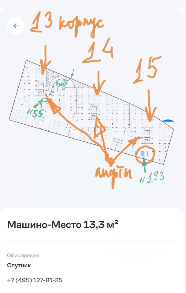 Номера 193 и 55, оба на минус 3 этаже, под 13-14-15 корпусами (общий паркинг).