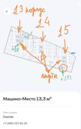 А машиноместо 55 - королевское, прямо у лифта в 13 корпус, потому стоит дороже - 3.5 млн, но оно того стоит на все 100%, вообще не нужно идти по паркингу - из машины сразу в лифт.
