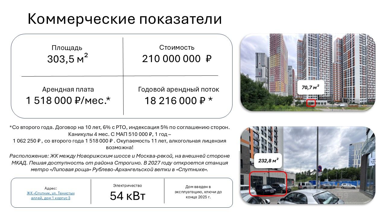 Федеральный арендатор, договор с РТО. МАП 1 518 000 ₽/мес. со второго года. Договор на 10 лет, 6% с РТО, индексация 5% по соглашению сторон. Каникулы 4 мес. С МАП 510 000 ₽, 1 год 1 062 250 ₽ , со второго года 1 518 000 ₽ .