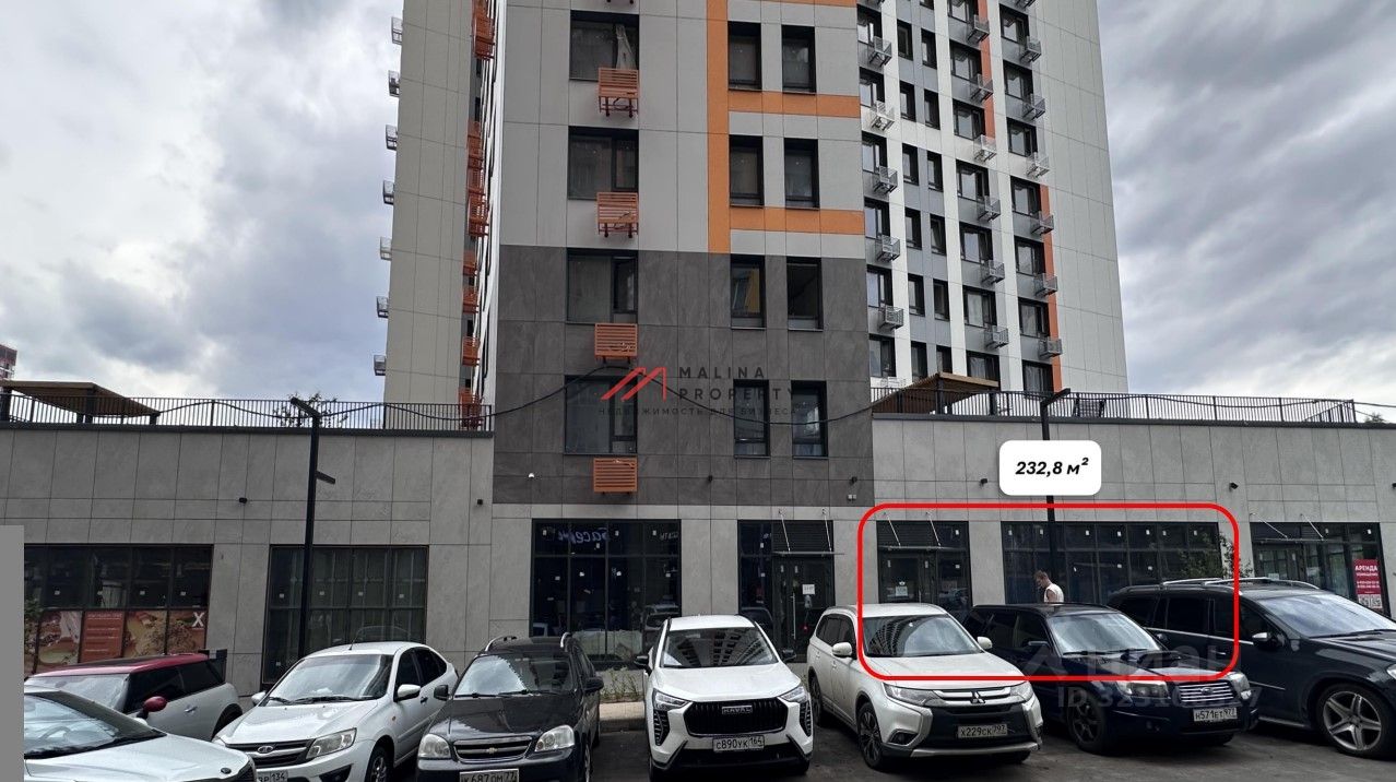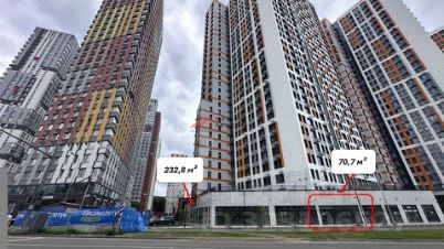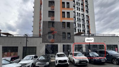 Помещение 303,5 м2 состоит из двух блоков 232,8 м2 и 70,7 м2, располагается на 1-м этаже в стилобатной части дома, два отдельных входа с фасада, высота потолка 4 м, витринные окна по фасаду. Электрическая мощность 54 кВт. Парковка перед фасадом. Место для размещения рекламы.
